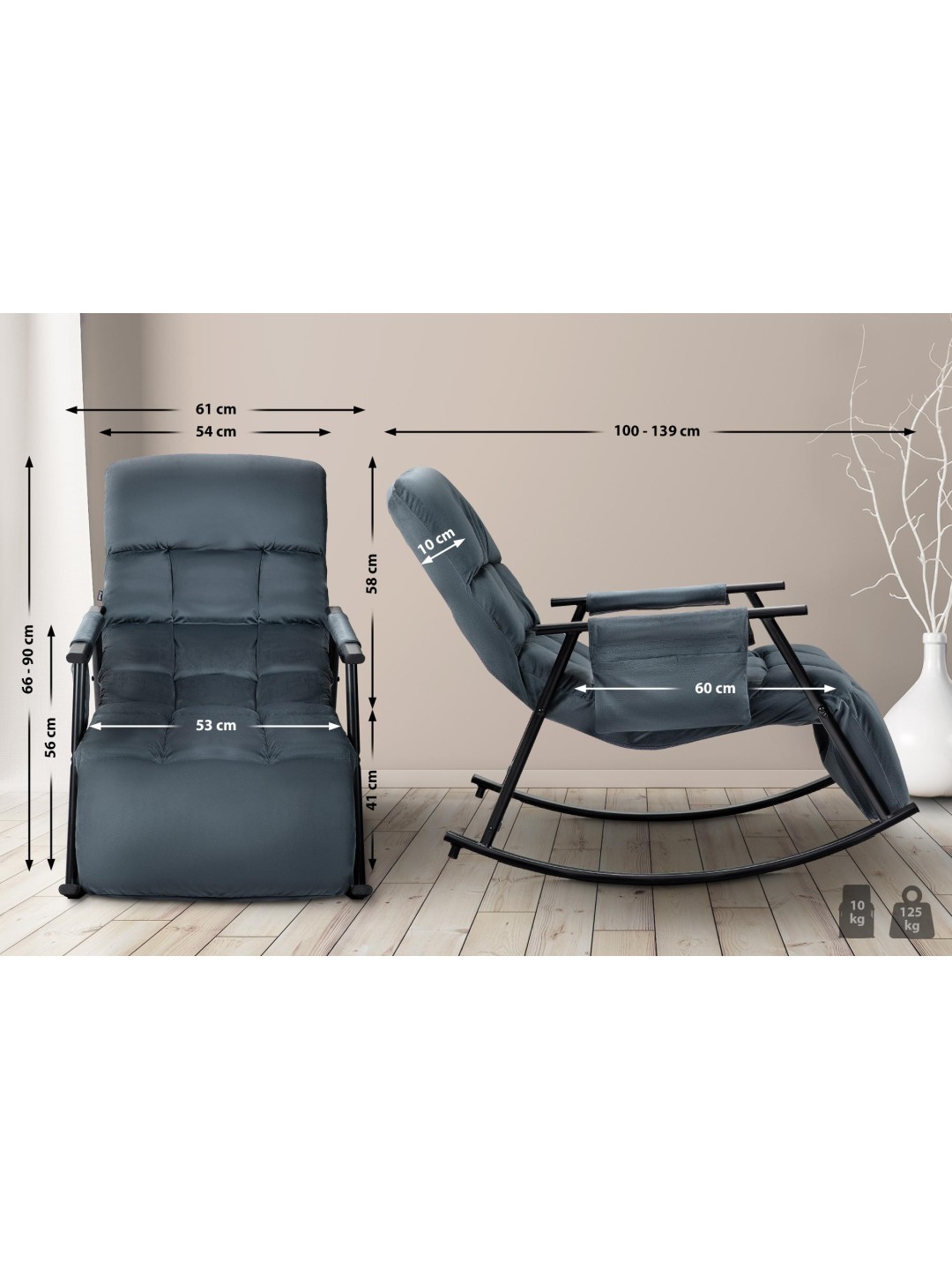 Tapițeria cu model matlasat la modă este disponibilă fie cu husă din material textil, fie din catifea. Cadrul din metal vopsit cu pulbere contribuie la aspectul modern dar si la stabilitatea ridicata. Scaunul balansoar poate fi încărcat în siguranță cu până la 125 de kilograme.