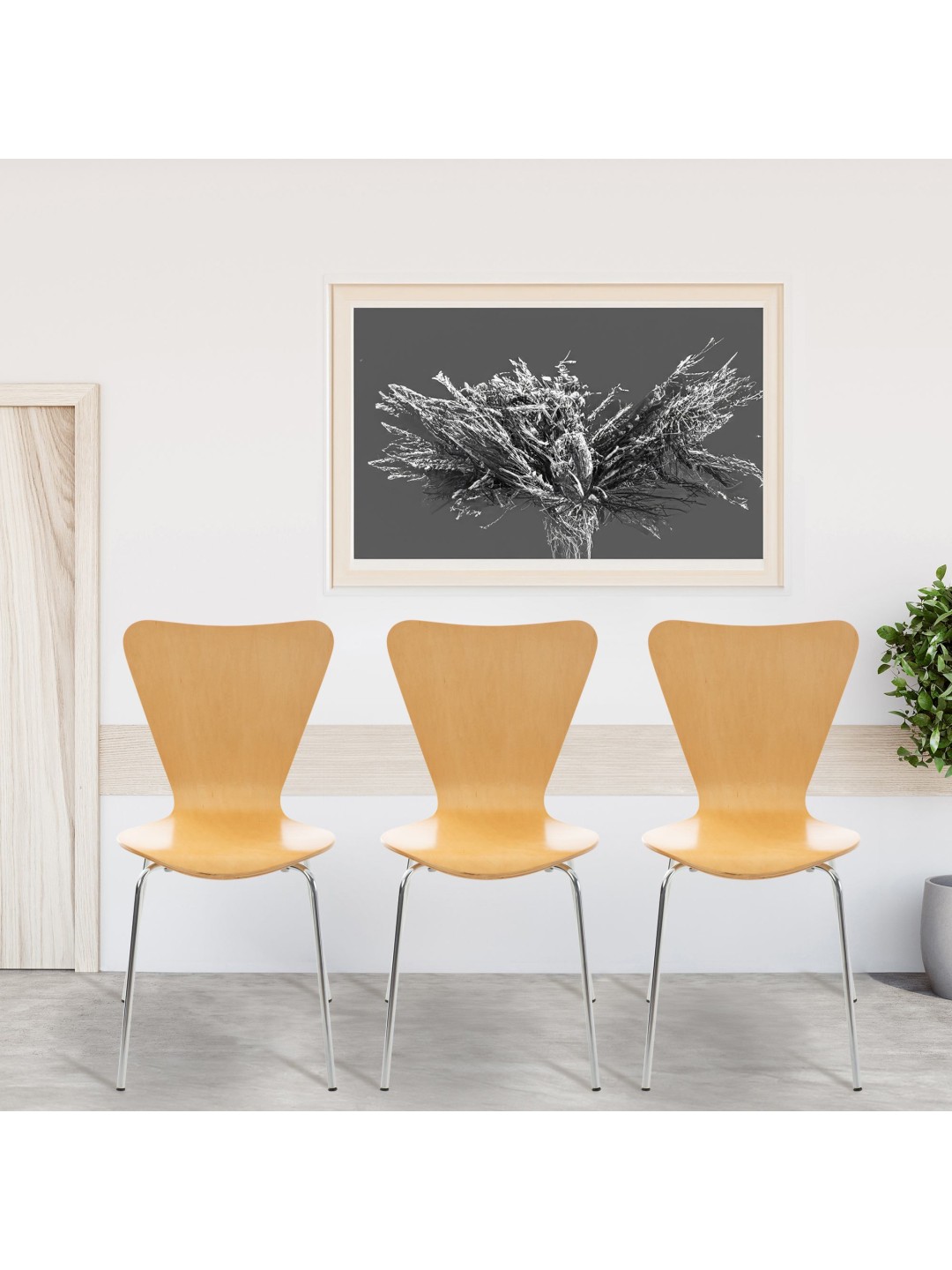 Acest scaun vizitator este ideal pentru săli de așteptare, târguri și alte evenimente. Pe lângă aspectul său și designul atemporal, acest scaun pentru vizitatori se caracterizează în special prin scaunul său cu formă ergonomică, ceea ce înseamnă că chiar și perioadele mai lungi de ședere nu devin obositoare. Sezutul este din lemn lacuit (culorile "stejar" si "nuc" sunt din furnir de lemn adevarat). Cadrul metalic cu aspect cromat asigură un suport stabil și sigur. Când nu sunt folosite, scaunele pot fi stivuite și depozitate pentru a economisi spațiu.