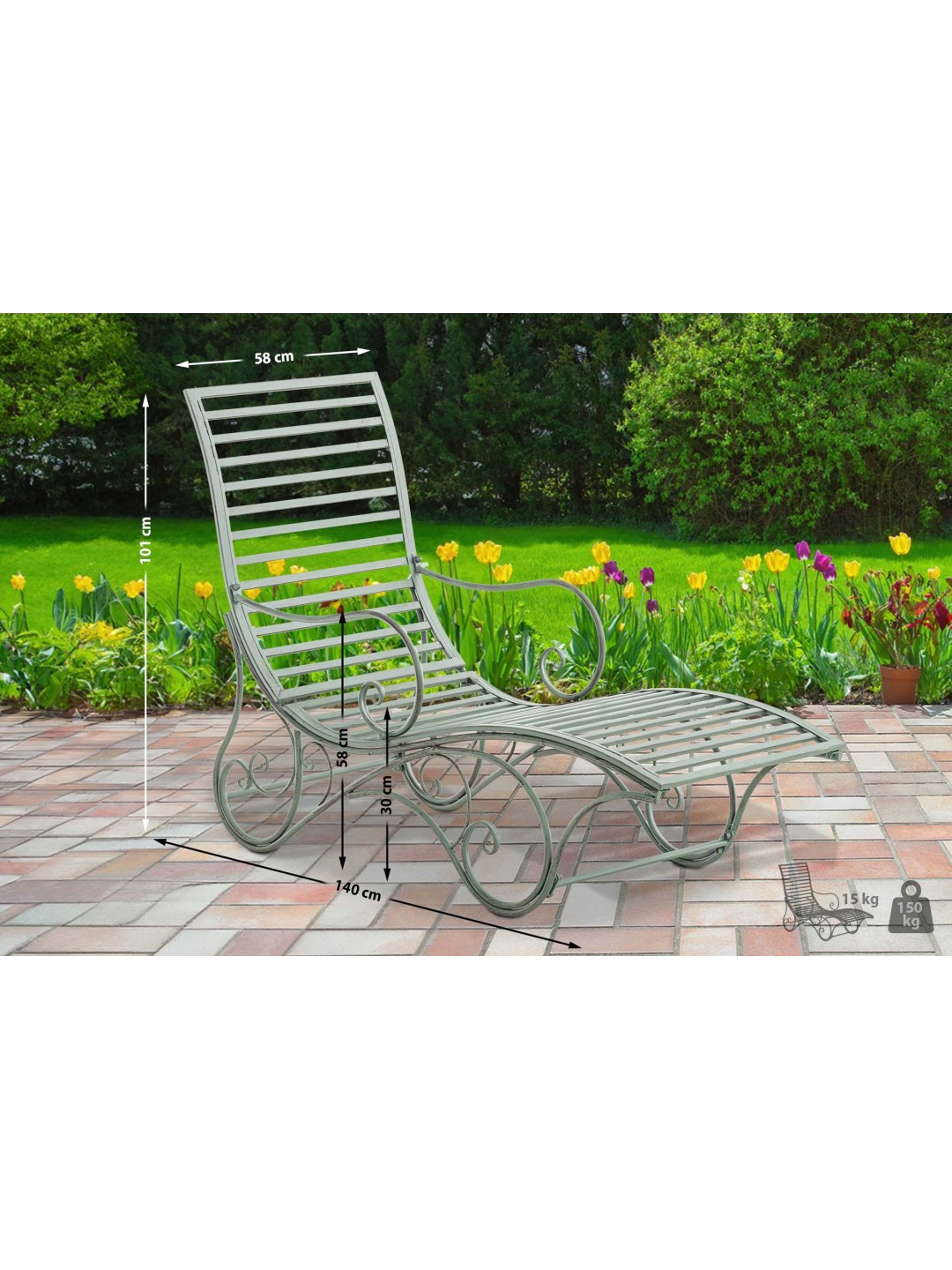 Dimensiunile generoase (101 cm înălțime totală, 58 cm lățime totală, 140 cm lungime totală, 30 cm înălțime scaun, 58 x 190 cm suprafață de culcare, 58 cm înălțime cotieră) asigură un nivel ridicat de confort. în aer liber. Fie ca scaun sau ca o piesă decorativă elegantă.